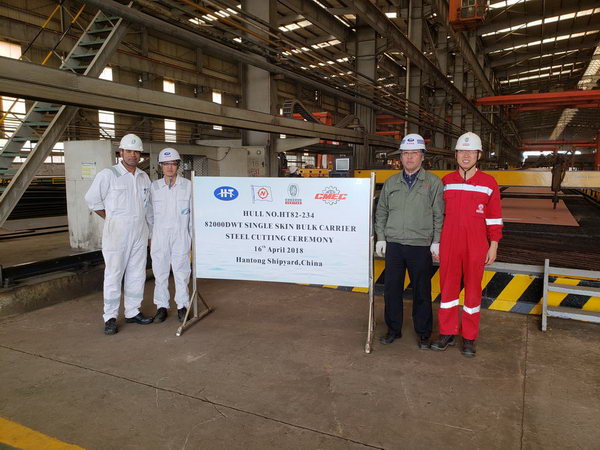 2018年4月16日,我司為日本NISSIN船東建造的82000噸散貨船(船體號(hào):HT82-234)正式開工,該船入BV船級(jí)社。公司領(lǐng)導(dǎo)、船東、船檢代表參加該儀式。