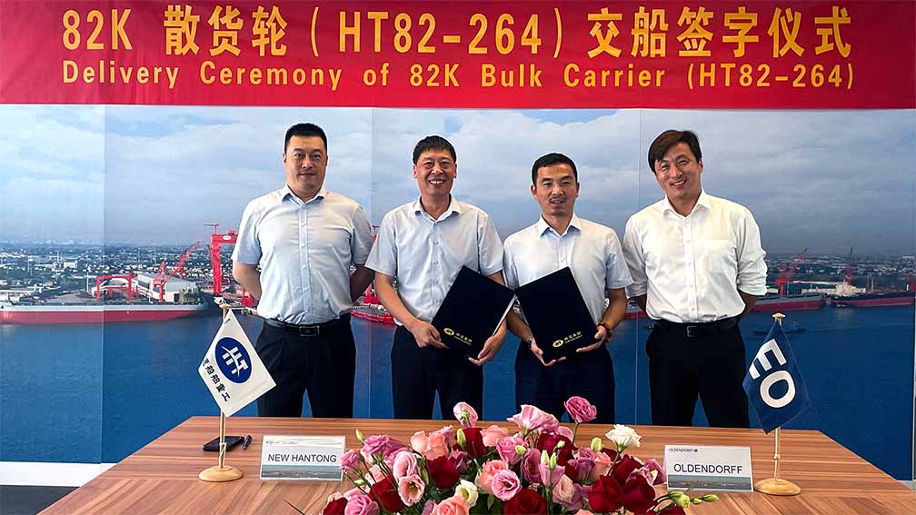 2023年7月31日,韓通為德國OLDENDORFF船東建造的82000噸散貨輪 “PENGLAI”(船體號:HT82-264)順利簽字交付。 HT82-264為系列船中的第6艘船,是航運市場主流的散貨船船型,也是公司的拳頭產(chǎn)品之一,入LR船級社。該船總長229米,型寬32.26米,型深20.35米,設(shè)計吃水12.2米,設(shè)計航速14.0節(jié),具有油耗低、綠色環(huán)保、適應(yīng)性能強、節(jié)能高效等諸多優(yōu)點。