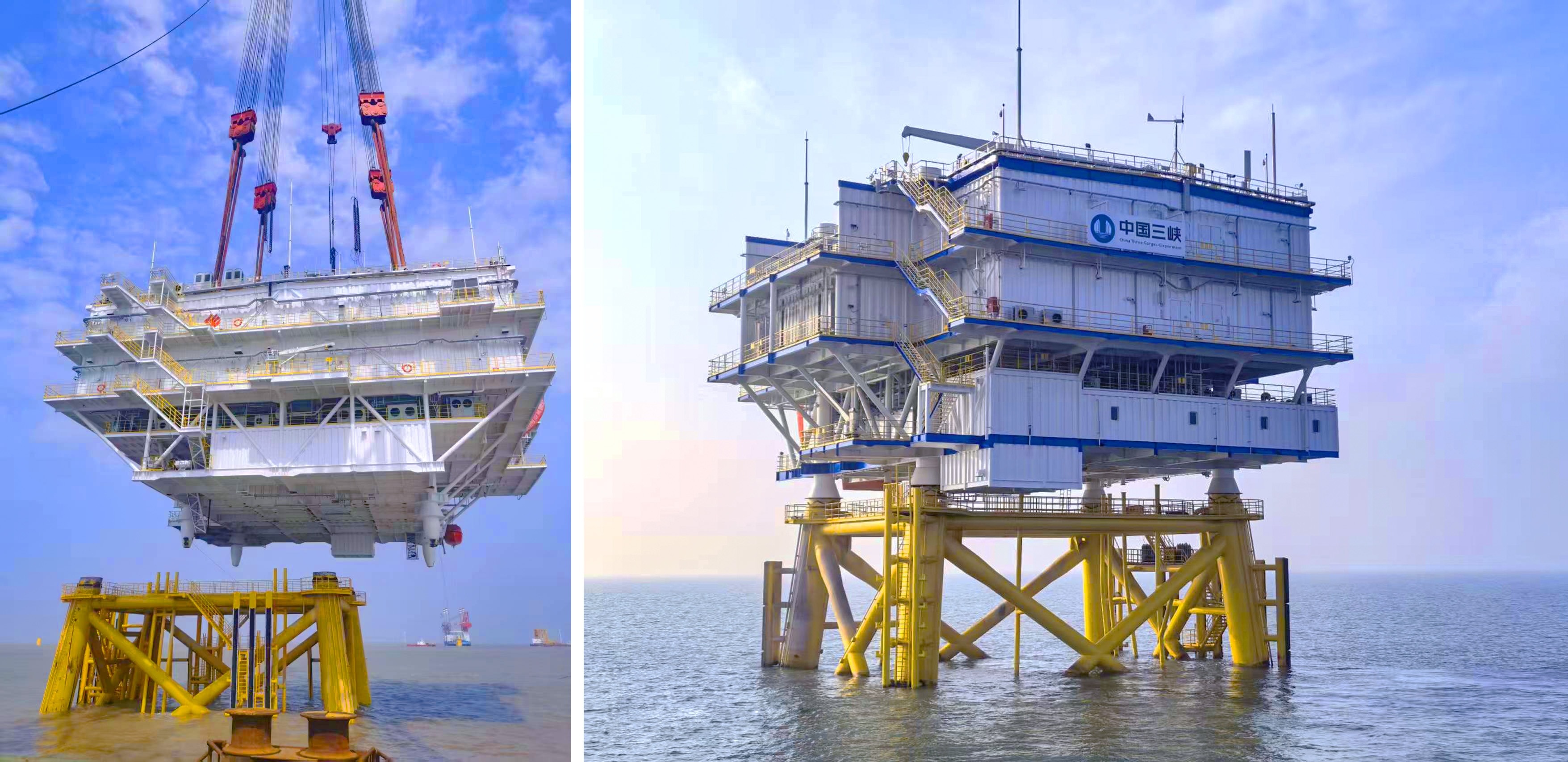 三峽江蘇大豐800MW海上風電項目H17、H8-1(6月25日)兩座海上升壓站吊裝順利完成。
