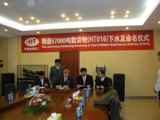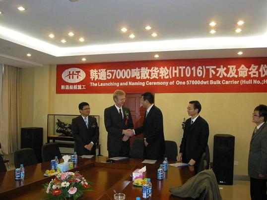 3月27日下午3:30,在韓通重工的1#船臺,隆重舉行了PD船東的首制57000噸散貨輪(船號:HT016)的下水儀式,參加儀式的有船東代表、LR船級社、貿(mào)易公司代表、銀行代表等相關(guān)人員。公司領(lǐng)導(dǎo)孟成君董事長、武亦文總經(jīng)理參加了儀式,并發(fā)表了熱情洋溢的講話,在武亦文總經(jīng)理的講話中,他代表孟成君董事長感謝船東的理解和支持,感謝貿(mào)易公司和銀行的大力支持。該首制船的成功下水也將韓通與國際知名船東PD的合作又向前推進(jìn)了一大步。儀式后,又舉行了HT017的上臺儀式,并在公司5#會議室簽訂了下水和上臺的相關(guān)文件。