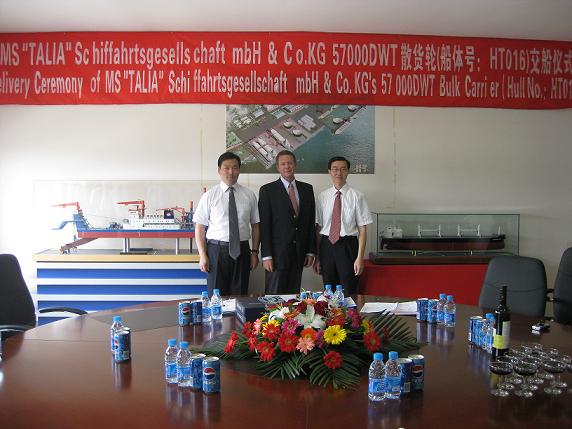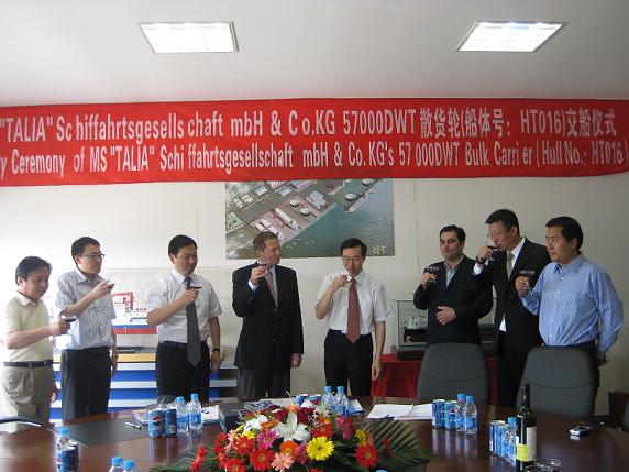 我司為德國船東Oltmann公司建造的 57000噸散貨輪于2009年6月4日下午2點順利交船。該船入英國勞氏船級社,代理公司為江蘇弘業(yè)公司。HT016于2008年12月16日上臺,2009年3月27日下水。HT016是PD項目系列船在我司建造的第一條船。目前該船已經(jīng)順利交給租家。整個交船儀式沉浸在喜欣的氣氛之中,儀式最后大家舉杯歡慶、合影留念。