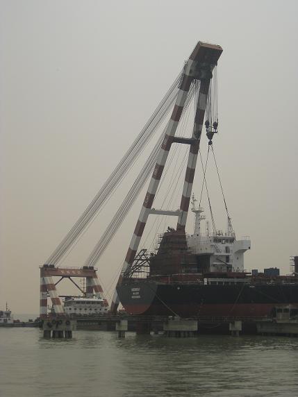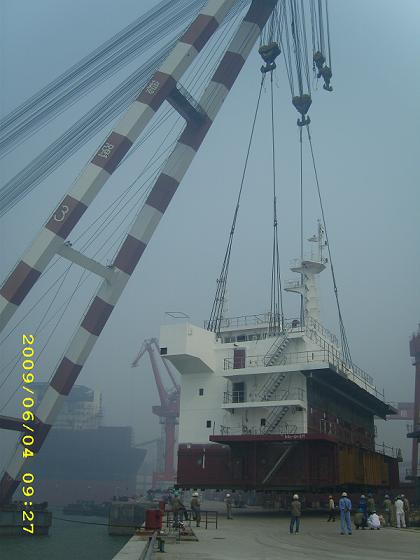 2009年6月4日、5日兩天,57000噸散貨輪(船體號HT003、HT012)上建吊裝在韓通重工圓滿完成。本次吊裝利用穩(wěn)強(qiáng)3號浮吊進(jìn)行上建整體吊裝。高層領(lǐng)導(dǎo)對此次工藝改進(jìn)高度重視,全程現(xiàn)場跟蹤指導(dǎo)。