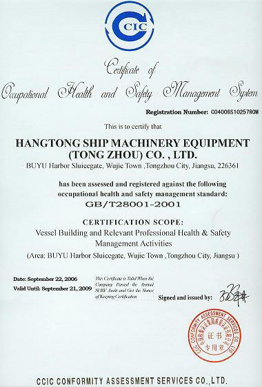 2006年8月28日,韓通船舶重工有限公司通過CCIC認(rèn)證中心關(guān)于環(huán)境安全體系的認(rèn)證,并取得了國家認(rèn)可的ISO14000的證書,這是據(jù)2006年8月份取得ISO9001證書又一重大成果。