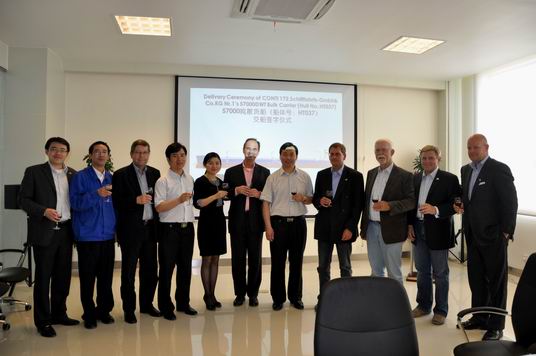2010年5月17日,江蘇新韓通船舶重工有限公司碼頭彩旗飄揚、人潮攢動。新韓通船舶重工為德國CONTI船東建造的第一艘57000噸散貨輪——HT037在公司碼頭隆重舉行命名及交船儀式。CONTI航運、英國勞氏船級社、揚中市委領(lǐng)導(dǎo)等有關(guān)領(lǐng)導(dǎo)和來賓應(yīng)邀參加了該儀式并進(jìn)行了發(fā)言。命名交船儀式結(jié)束后,各位領(lǐng)導(dǎo)和來賓登輪參觀了" POS ACHAT "輪。