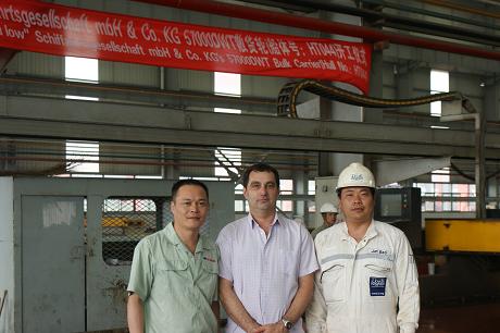 2010年8月16日上午10:00,我司為PD建造的57000噸散貨輪(船體號:HT044)在我司新船體車間舉行開工儀式,該船入LR船級社。陳林軍常務(wù)副總、PD項目駐廠經(jīng)理Babic及英國勞氏船級社代表參加了該儀式。