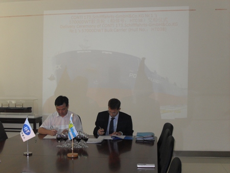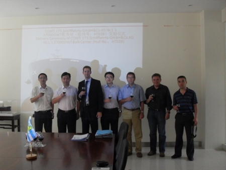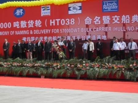2010年9月7日江蘇新韓通船舶重工有限公司迎來(lái)了又一個(gè)值得慶祝和紀(jì)念的日子—HT038的命名及交船儀式。該57000DWT散貨輪為我司為德國(guó)CONTI 船東建造并交付的第二條散貨輪,該船被命名為“POS ALEXANDRIT”. CONTI 船東副總裁奧布梅拉先生和監(jiān)造公司BBG董事霍倫巴克先生和英國(guó)勞氏船級(jí)社中國(guó)區(qū)經(jīng)理Alan Swinbank 和Alan Williams參加了該儀式并發(fā)表講話(huà)。儀式結(jié)束后,船東船檢代表等參觀了該船,并給予很高的評(píng)價(jià)。2010年9月8日下午2:00在新韓通會(huì)議室簽訂了該船的交船文件。至此,該船成功交付。