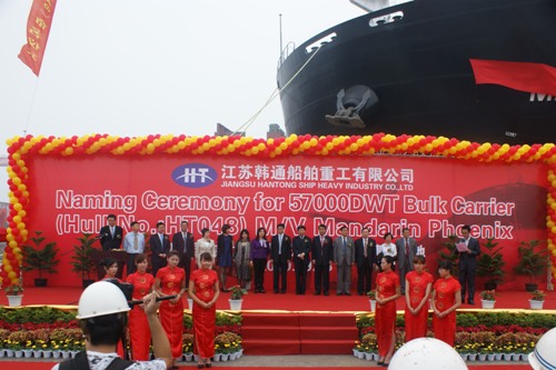 2010年9月28日,韓通船舶重工有限公司為DA SIN公司建造的57000噸散貨輪(HT048)達(dá)到了交船狀態(tài),在韓通重工碼頭為該船舉行隆重的命名及交船儀式,該船入CCS船級(jí)社,被命名為“MANDARIN PHOENIX”。 大連國(guó)際合作集團(tuán)股份有限公司總經(jīng)理陳榮輝先生,副總經(jīng)理張?zhí)m水先生、申明暄先生,大新控股有限公司副總經(jīng)理張百世先生等參加了該儀式。儀式結(jié)束后,在韓通總經(jīng)理武亦文先生,副總陳興先生的陪同下船東船檢代表參觀了該船,并給予很高的評(píng)價(jià)。