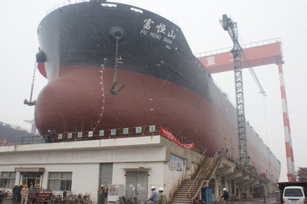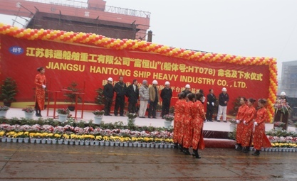 2011年1月18日下午下起了南通今年第一場雪,在韓通2號船臺舉行的57000噸散貨輪(船體號HT078)下水命名儀式上,船東代表戴加火先生盛贊該船的建造團(tuán)隊?!敖K韓通船舶重工有限公司有能力建造堅固、可靠的船舶,我們堅信眼前這艘57000噸散貨輪的建造質(zhì)量符合要求。”