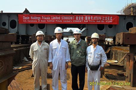 我司為大新船東建造的57000噸散貨輪(船體號(hào):HT070)于2011年9月3日在我司1號(hào)船臺(tái)舉行了上臺(tái)儀式,該船入BV船級(jí)社。潘學(xué)軍副總及船東船檢代表參加了該儀式。