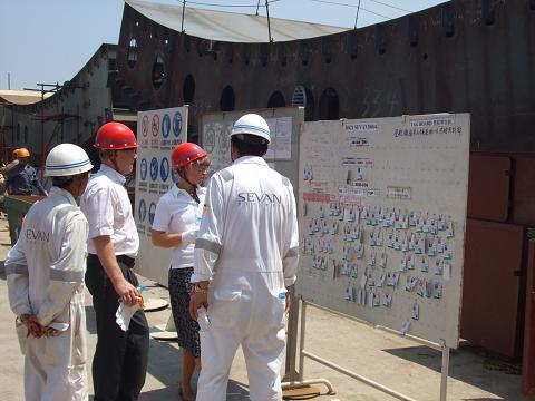韓通船廠項(xiàng)目總監(jiān)李昭先生和海工部安全經(jīng)理沈利德先生等項(xiàng)目人員帶領(lǐng)客人參觀了在建的Sevan300 FPSO #4。
