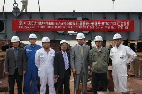 我司為韓國(guó)現(xiàn)代船東建造的57000DWT散貨輪(船體號(hào):HT57-108)于2011年10月15日上午9:00在我司1號(hào)船臺(tái)舉行了上臺(tái)儀式,該船入KR船級(jí)社。潘學(xué)軍副總及船東船檢代表參加了該儀式 |