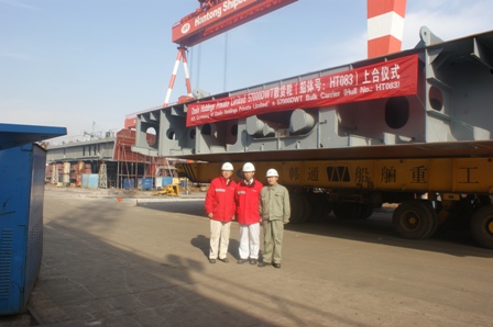 我司為大新船東建造的57000DWT散貨輪(船體號:HT083)于2011年12月23日上午10:00在我船臺舉行了上臺儀式,該船入BV船級社。李繼念副總及船東船檢代表參加了該儀式。