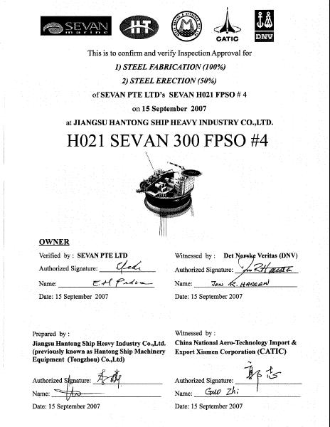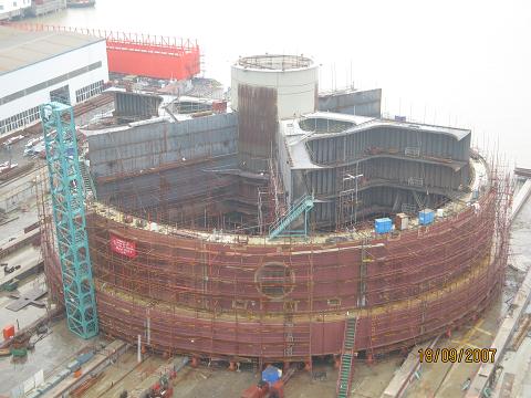 二零零七年九月十五日是韓通重工的雙喜日,船廠迎來了同一天完成Sevan300 FPSO(H021)兩個節(jié)點的目標: