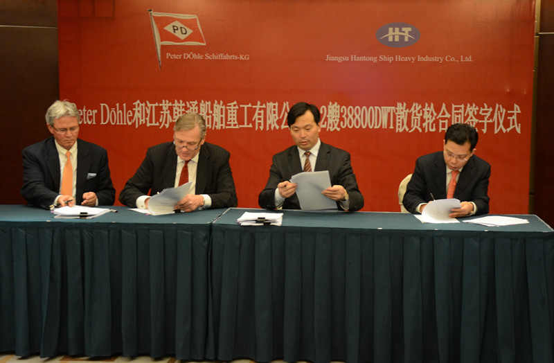 2013年4月19日,我司與德國船東Peter DÖhle在文景國際大酒店簽訂3+2艘38800 DWT散貨船合同(SDARI設計)。該批訂單將于2015年第二季度開始交付,公司堅持做專做精的經(jīng)營策略。該船型將與64000DWT散貨船并行為韓通船舶主打船型并系列生產(chǎn)。
