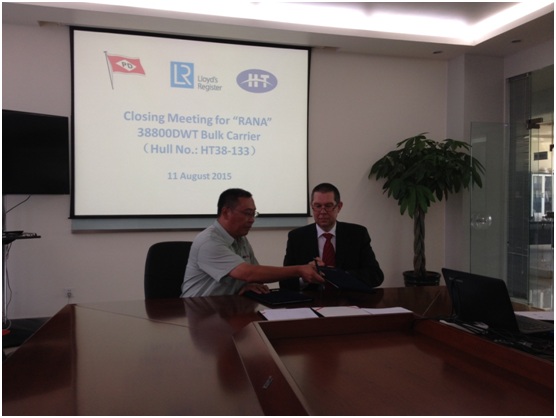 我司為德國PD船東建造的38000噸系列散貨輪(船體號:HT38-133)達到了交船狀態(tài),在韓通舉行交船簽字儀式,至此該船成功交船,入LR船級社。