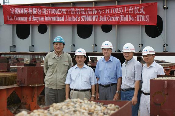 7月11日,在韓通船舶重工有限公司的1號船臺舉行了57000噸散貨輪的上臺儀式,該船為香港寶源國際建造,入LR級,是該船東在韓通建造4艘系列船的首制船。武亦文總經(jīng)理(韓通),劉庚寶董事長(寶源國際)以及LR船級社的代表參加儀式。
